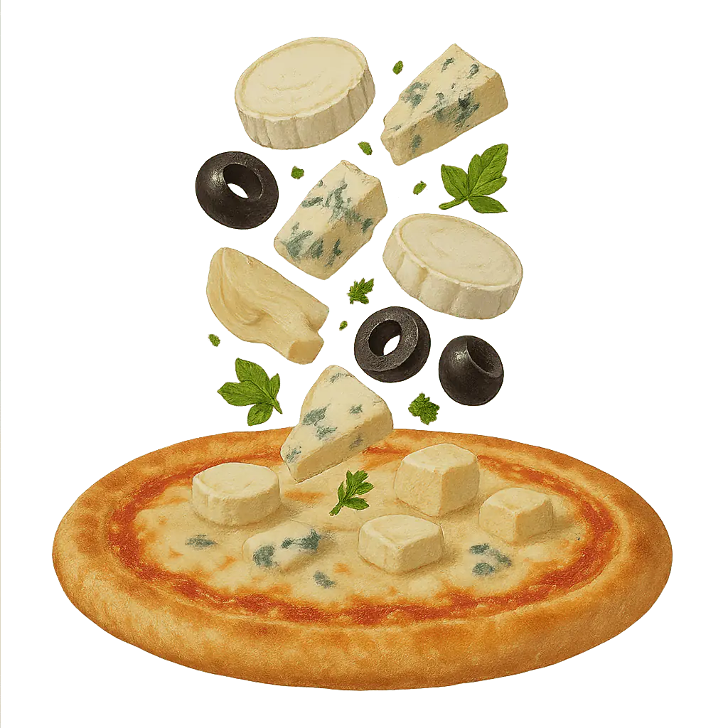 Sauce Tomate, Mozzarella, Chèvre, Gorgonzola, Parmesan, Olive, Origan