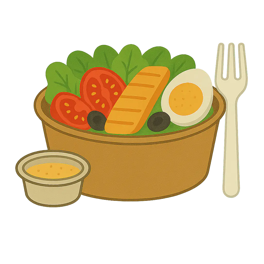 Salade, tomate, poulet, Oeuf, olives. Dosette sauce salade & couvert