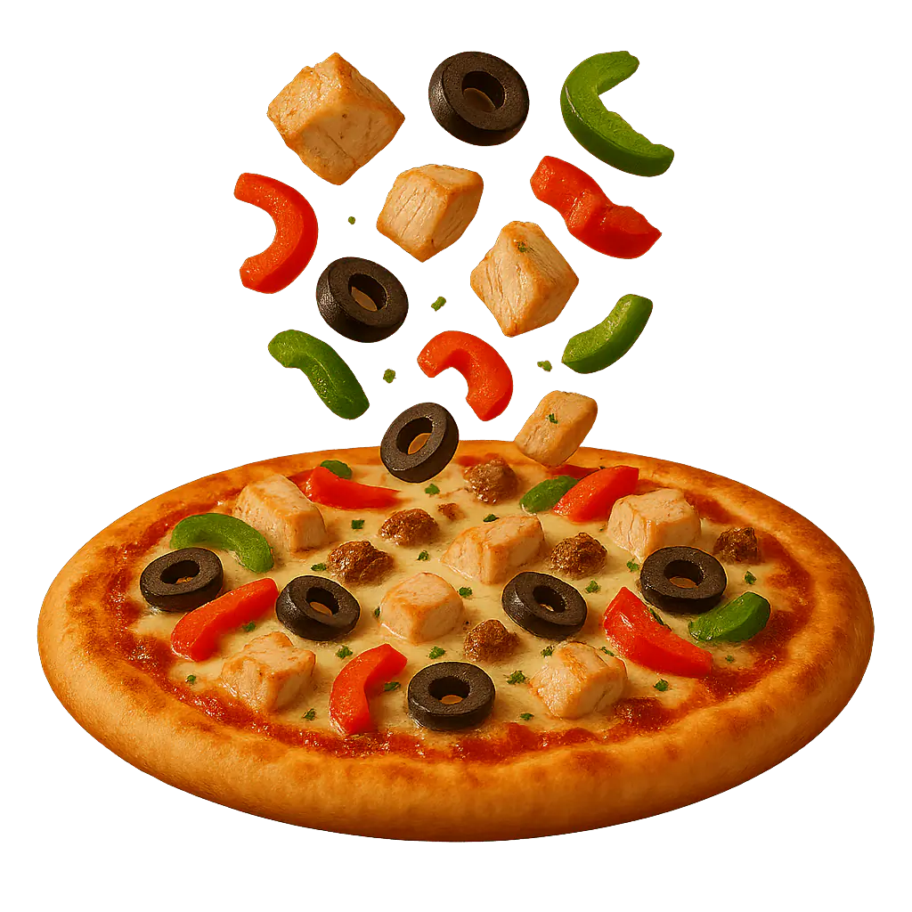 Sauce tomate, Mozzarella, Poulet mariné au curry, Poivron, Olive, Origan