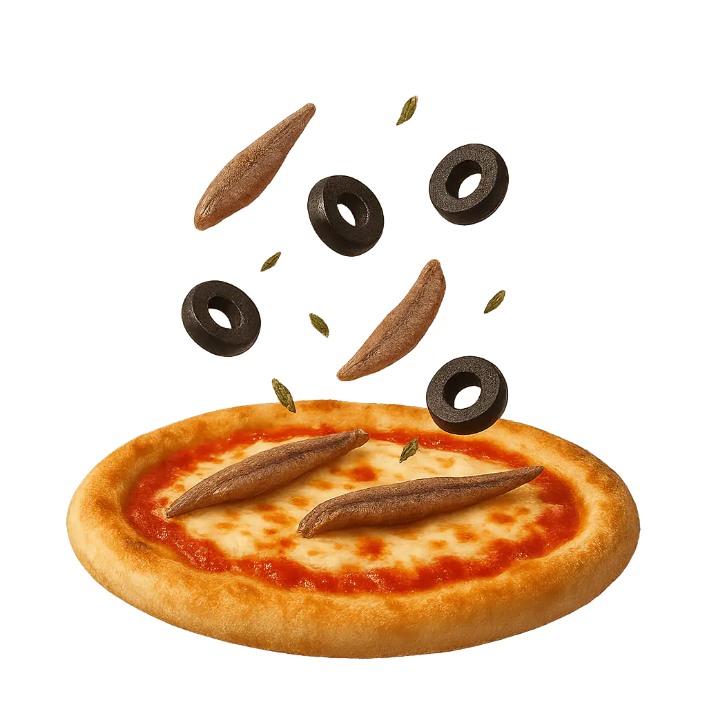 Sauce Tomate, Mozzarella, Anchois, Olive, Origan