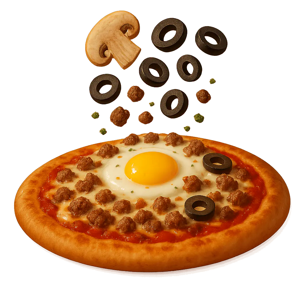 Sauce tomate, Mozzarella, Champignon, Viande hachée, Œuf, Olive, Persillade