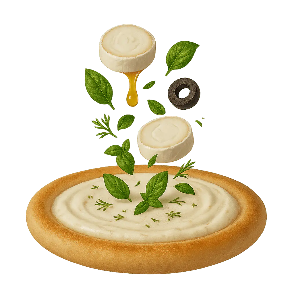 Crème fraîche, Fromage de chèvre, Miel, Basilic, Olive, Origan
