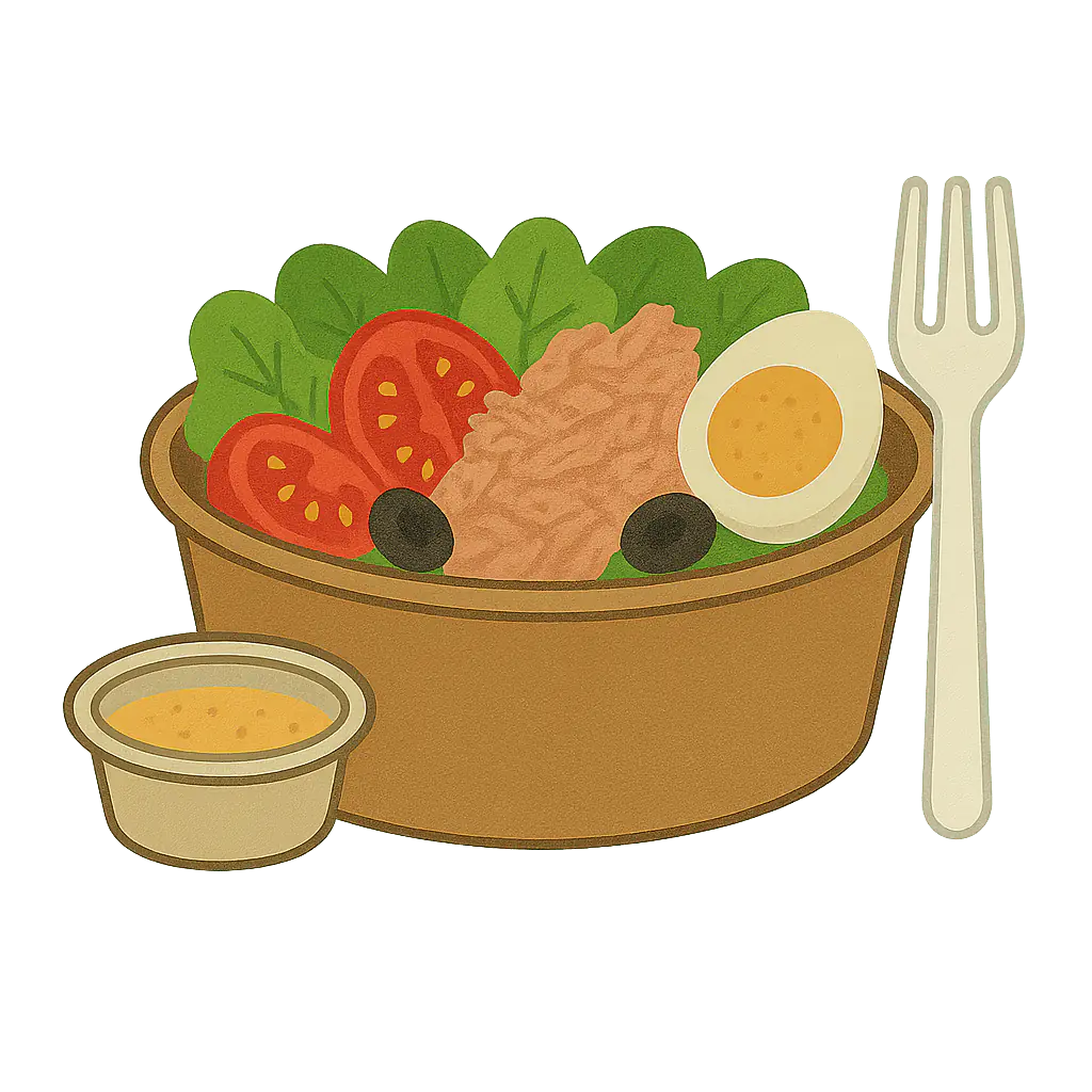 Salade, tomate, thon, oeuf, olives. Dosette sauce salade & couvert